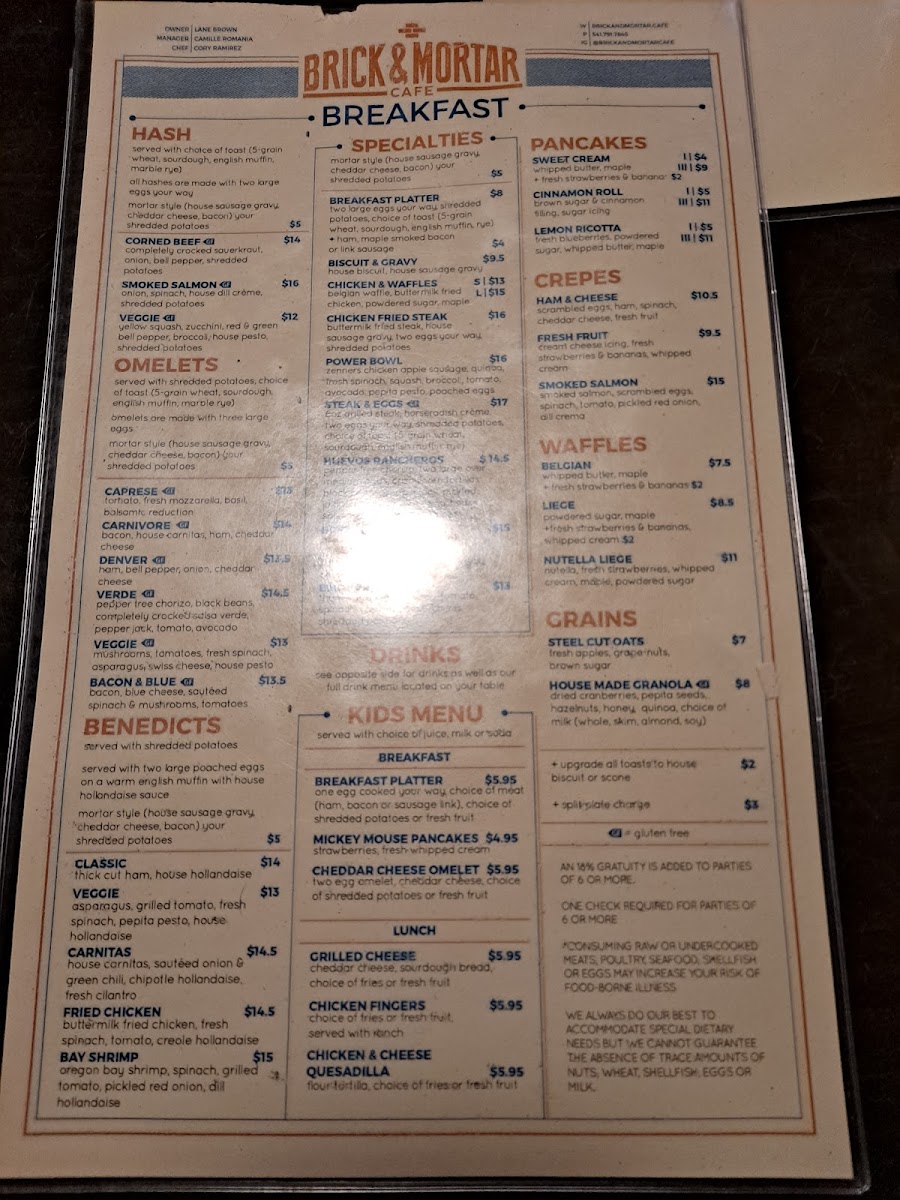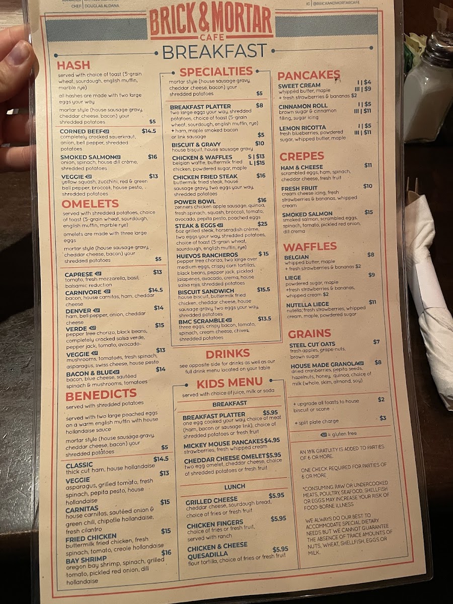 pepper tree chorizo, two large over medium eggs, crispy corn tortillas, black beans, pepper jack, pickled jalapeños, avocado, crema, house salsa roja, shredded potatoes